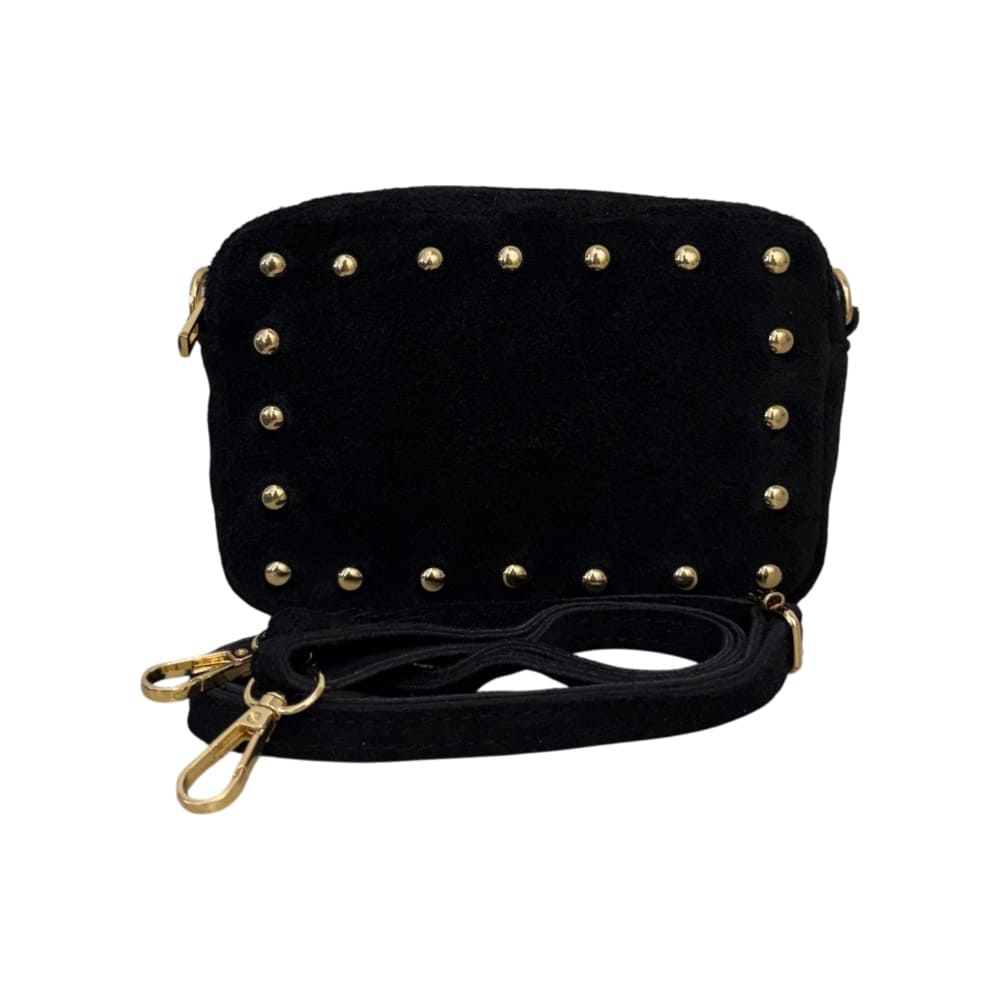 Bolso mini bandolera de piel de ante en color negro. Lleva cremallera y correa larga ajustable de bandolera.