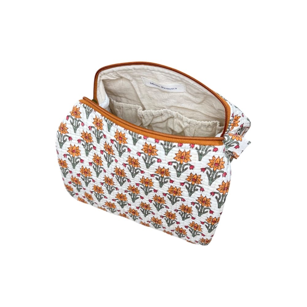 Neceser grande acolchado, realizado con tejidos de algodón de la india. Forma cuadrada. Cierre en cremallera. Interior forrado con tejido de algodón beige. Lleva bolsillos interiores a ambos lados, si se personaliza uno de los laterales, se pierden los bolsillos de esa parte.